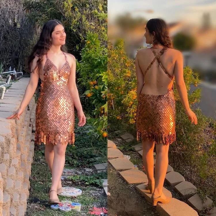 Shay modeled the statement dress on her Instagram account. From a distance it looks like a shimmering chainmail style flapper dress. When you look up close you can get a better idea of all the detail that went into creating this stunning piece. Shay collected 2,652 pennies, cleaned them all, drilled holes in them — and that’s all before she was able to start sewing them together into a dress.