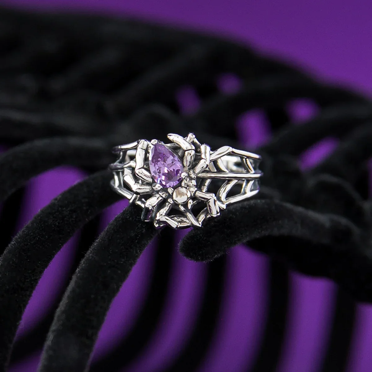 Handcrafted in nickel-free solid sterling silver and antiqued for contrast, the Spinning Spider Ring is a gothic showpiece that pairs perfectly with its matching earrings. Perched in endearing three-dimensional detail, the sculpted spider rests at an angle atop an asymmetrical webbed band. Its body is crowned with a teardrop-shaped amethyst cubic zirconia crystal, adding a glittering element of eerie elegance. The polished silver band features a delicate cutout web design that tapers gracefully around the finger.
