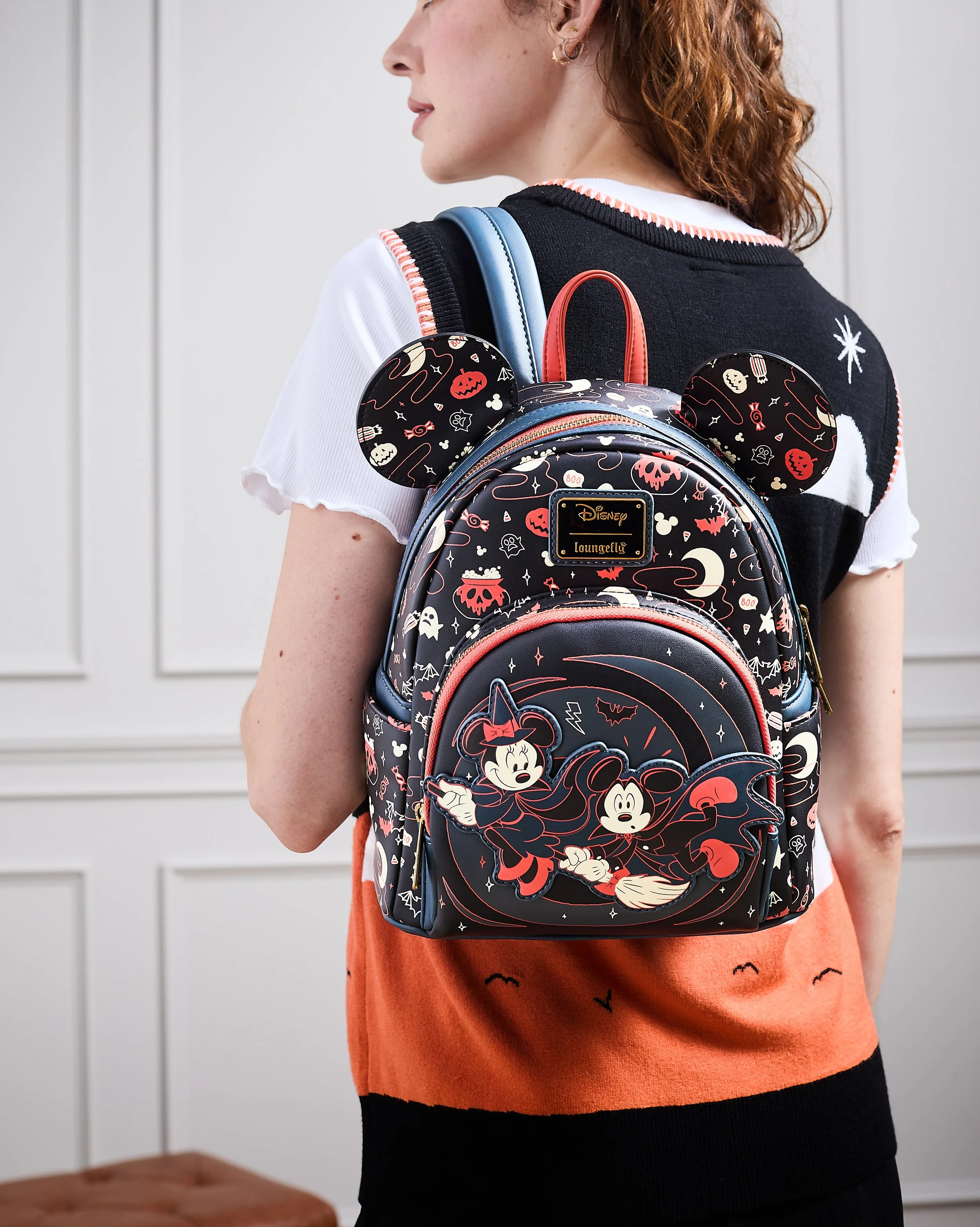 Prepare for spooky season with this Disney mini backpack! Featuring glow-in-the-dark designs of Mickey and Minnie in costumes on the front pocket, the body includes more glowing designs and applique ears. With side pockets and adjustable straps, this bag is perfect for fall activities. Don't forget the matching crossbody and wallet sold separately!