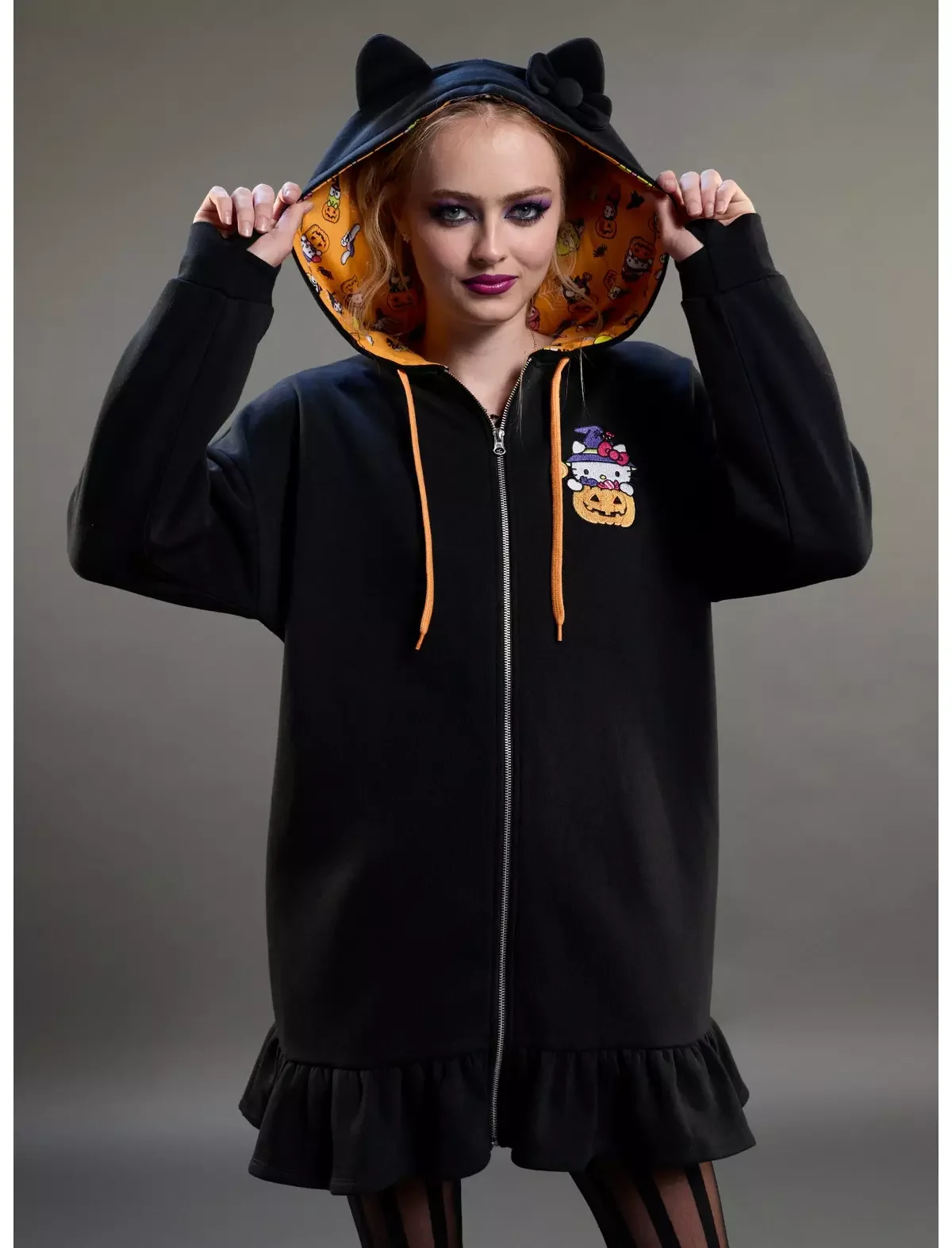 Get ready to look scary cute this fall! Hello Kitty and her friends are featured on this hoodie dress in adorable Halloween costumes down the sleeves, with Hello Kitty peeking out of a pumpkin embroidered on the chest. Comes with plush cat ears on the drawstring hood, plus a ruffle layer at the skirt hem and a zipper down the center.