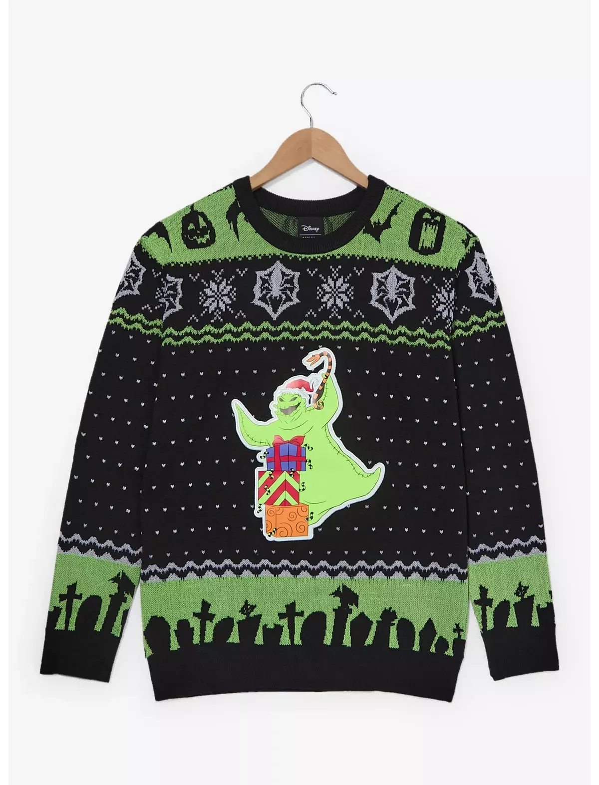 Spooky meets cozy in the best possible way. This holiday sweater brings Nightmare Before Christmas energy straight to your ugly sweater party — perfect for fans who like their Christmas cheer with a side of Halloween Town — available exclusively at BoxLunch.