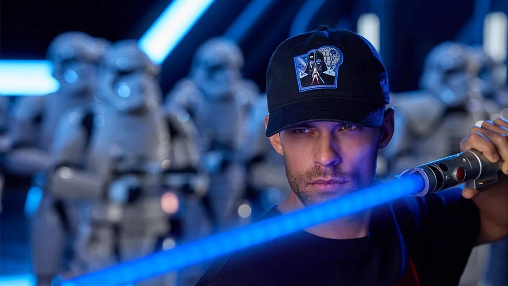 Jedi can gear up in a new sweatshirt and hat featuring Luke and Vader facing off, with the ominous Death Star pictured in the background. If you lean more toward the Dark Side there’s a t-shirt and matching tote with Darth, Stormtroopers and the Death Star set against a smoldering red background. If you can’t choose a side don’t worry — the limited-edition Magic Band features both designs.